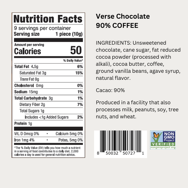 Crafting a 90% dark chocolate with only the highest-quality cacao beans, creates a smooth and velvety taste normally attributed to a 70% chocolate, but with much less sugar.